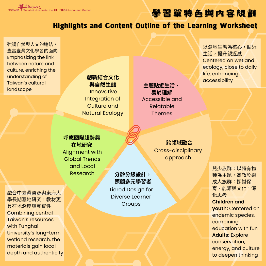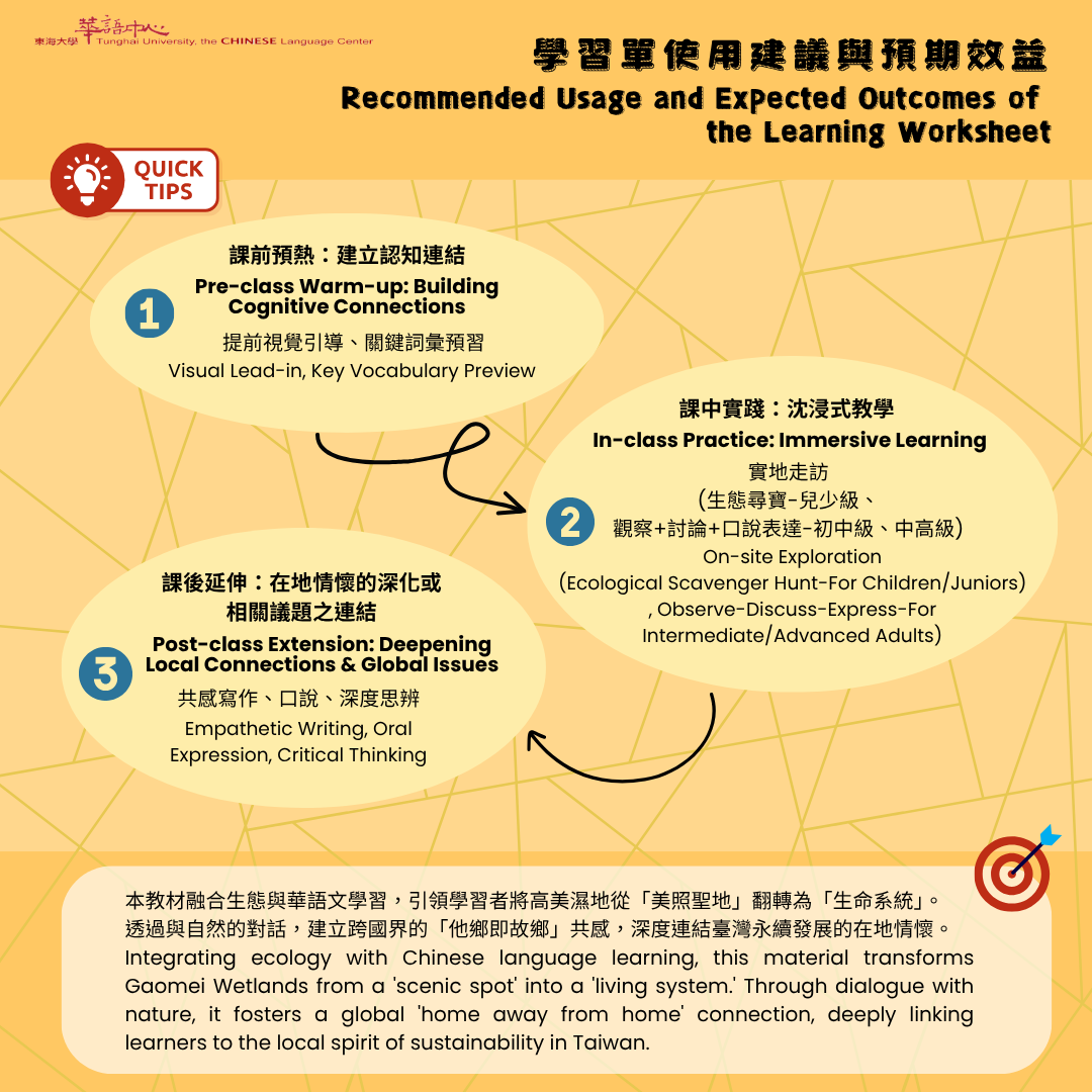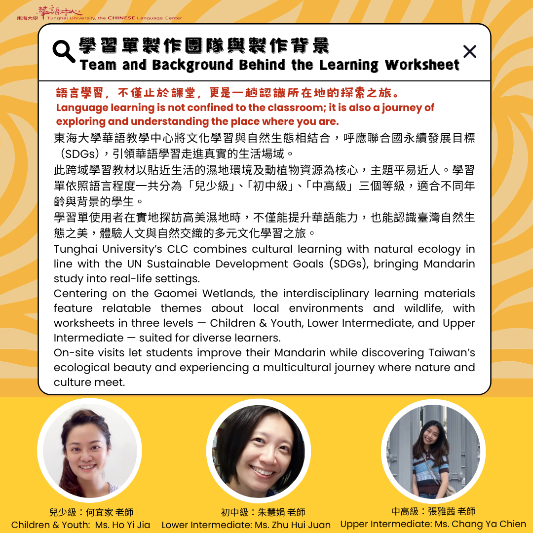 (1) Co-authored by Interdisciplinary Experts: Planned by Mandarin teachers Chu Hui-Chuan, Ho I-Chia, and Chang Ya-Chien, combined with the professional knowledge of Professor Lin Huei-Jane and her team, who have long focused on the ecological research of the Gaomei Wetlands. This ensures the materials are ecologically accurate, practical for language learning, and easy to understand.